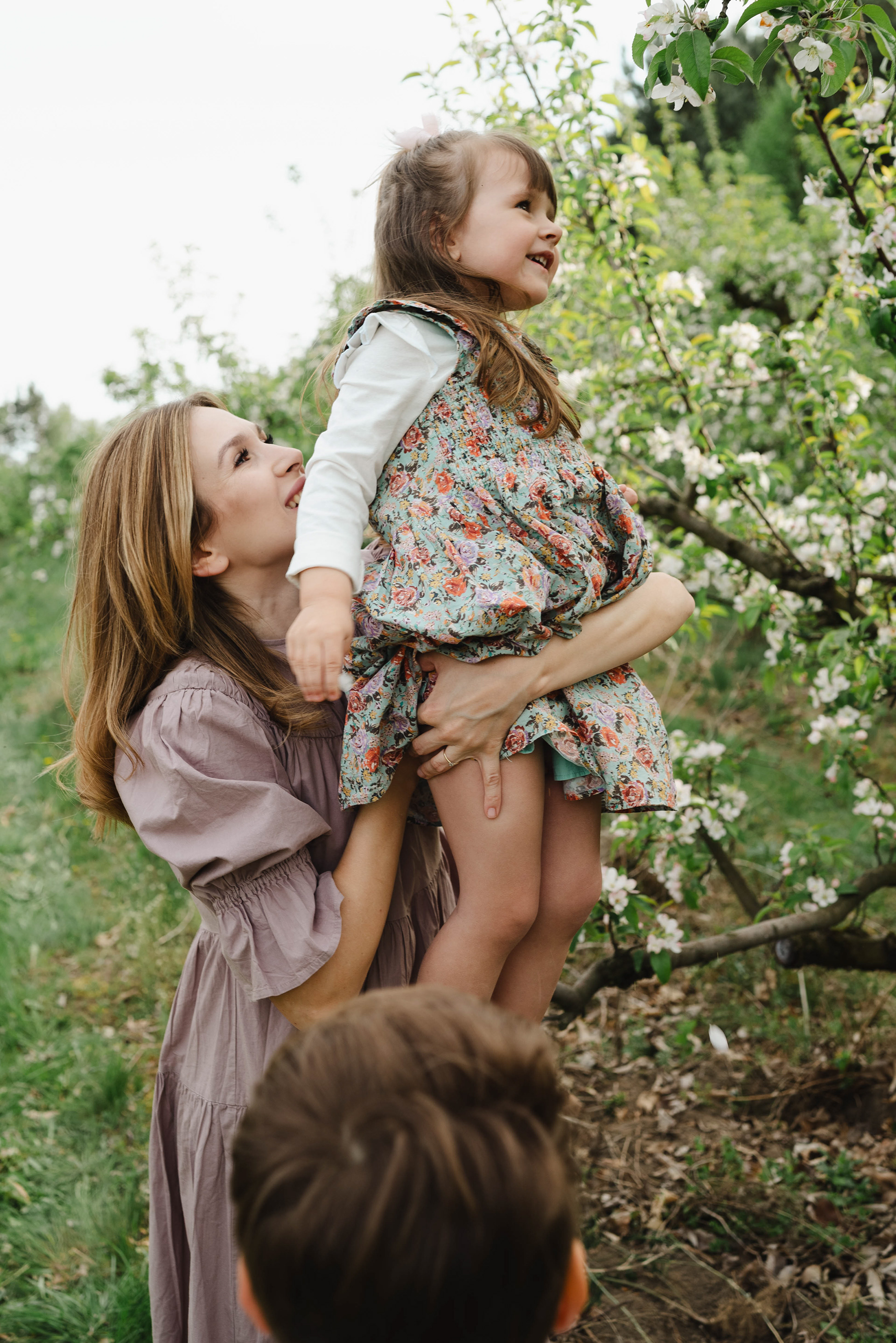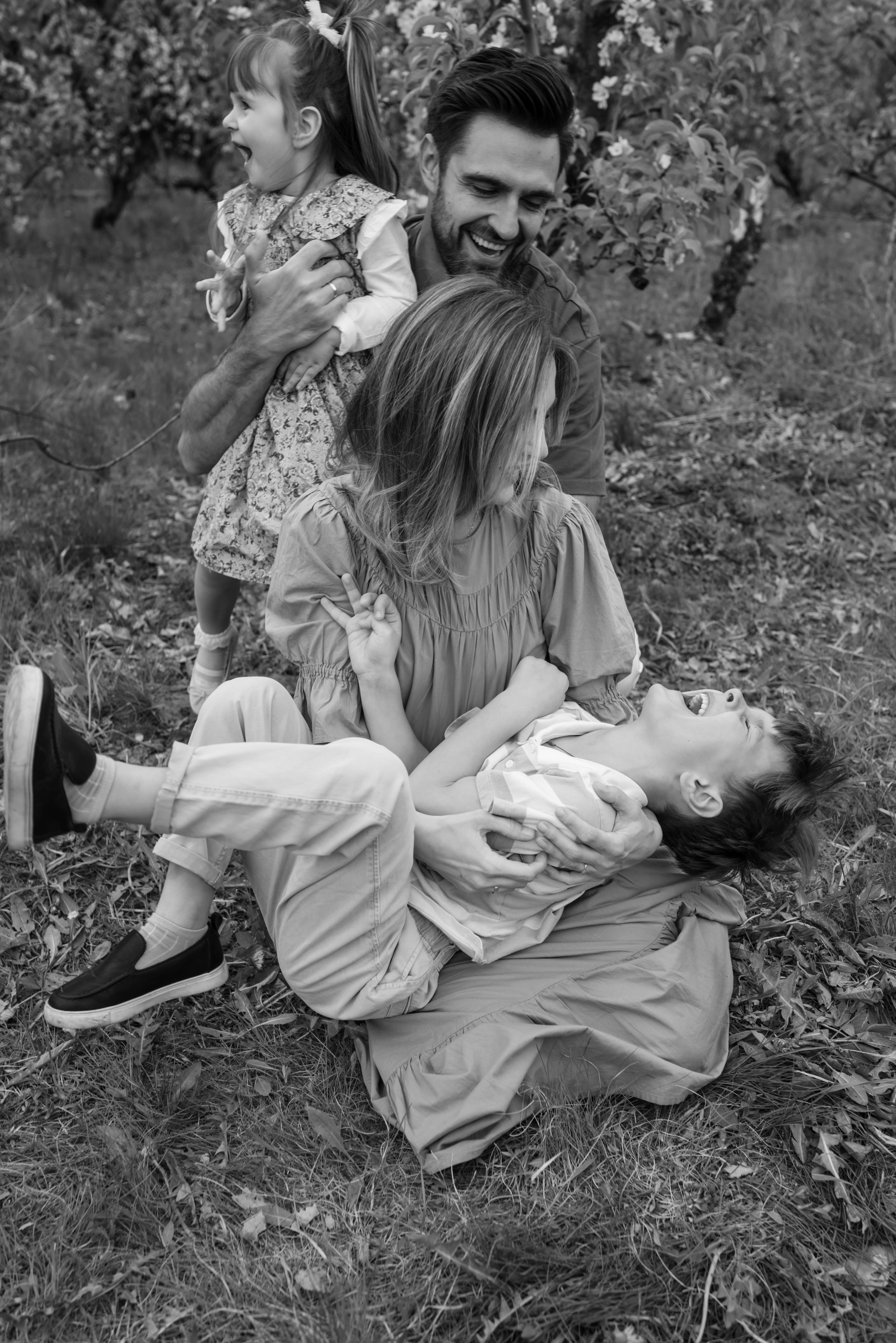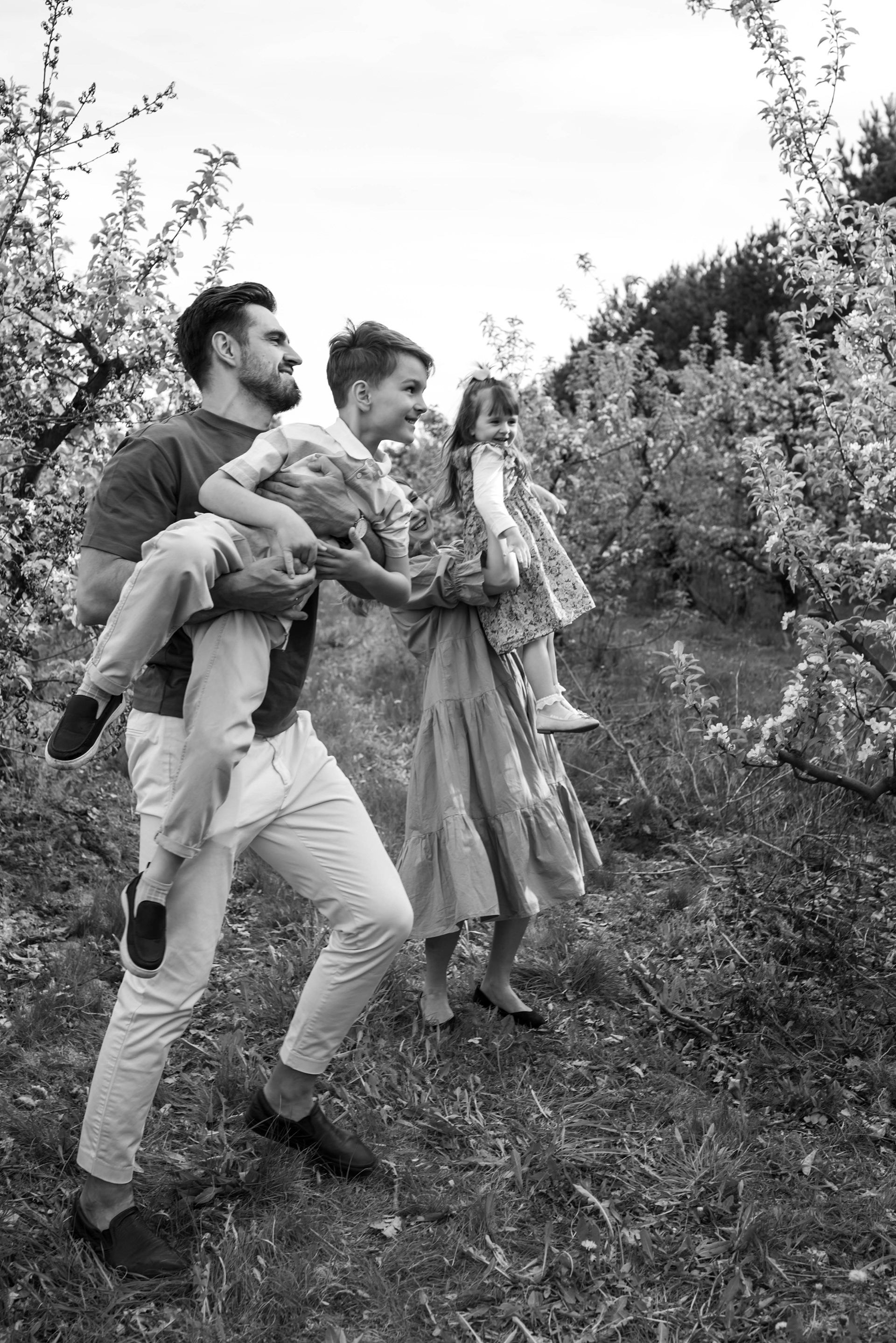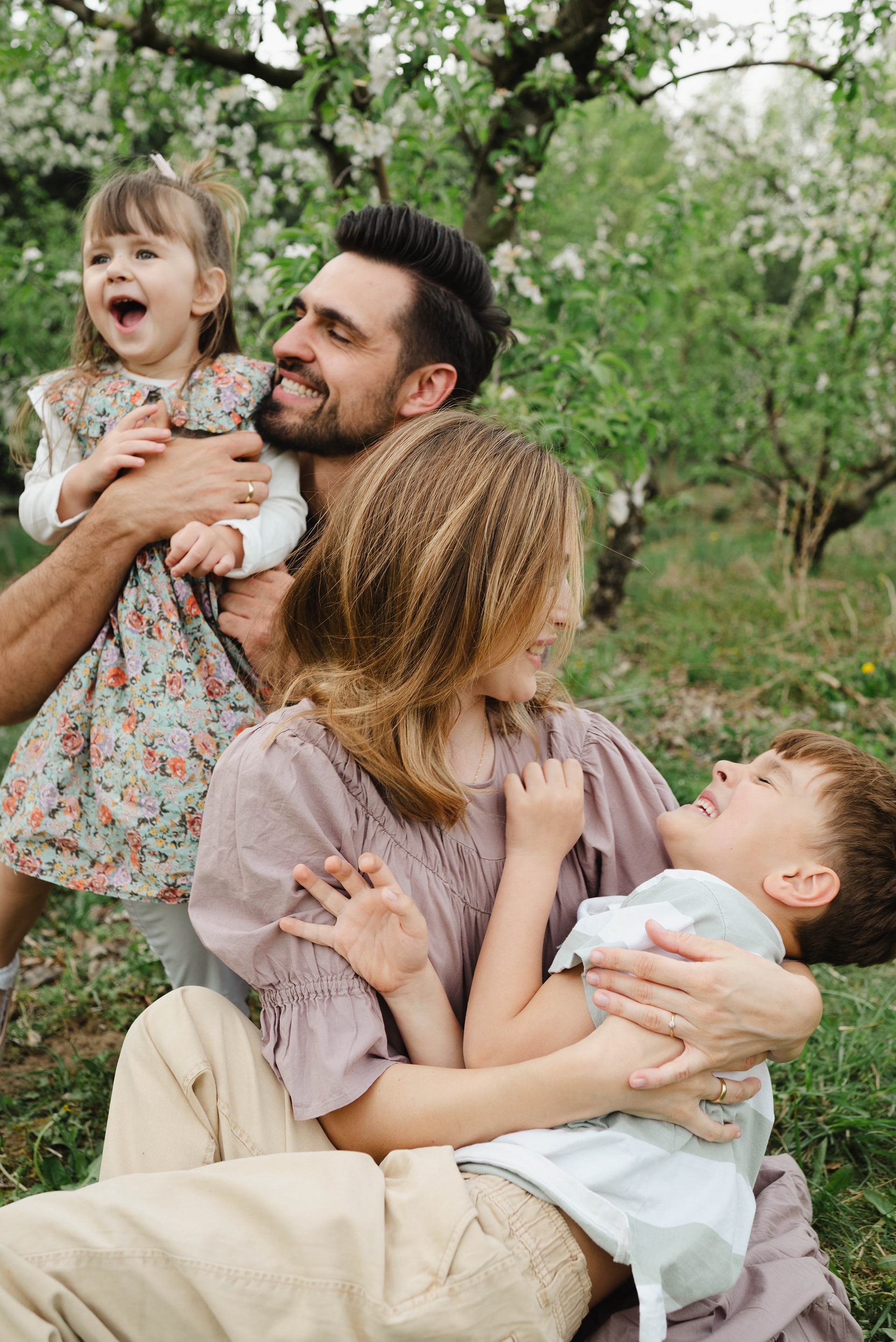 Wpadliśmy do sadu jak do zaczarowanego ogrodu. Może nie było morza kwiatów, ale to miejsce miało w sobie coś spokojnego, coś, co od razu rozluźnia. Dzieci nie potrzebowały nawet chwili, żeby się rozkręcić. Wystarczyło parę zadań ode mnie i zapomniały, że to w ogóle jakaś sesja
